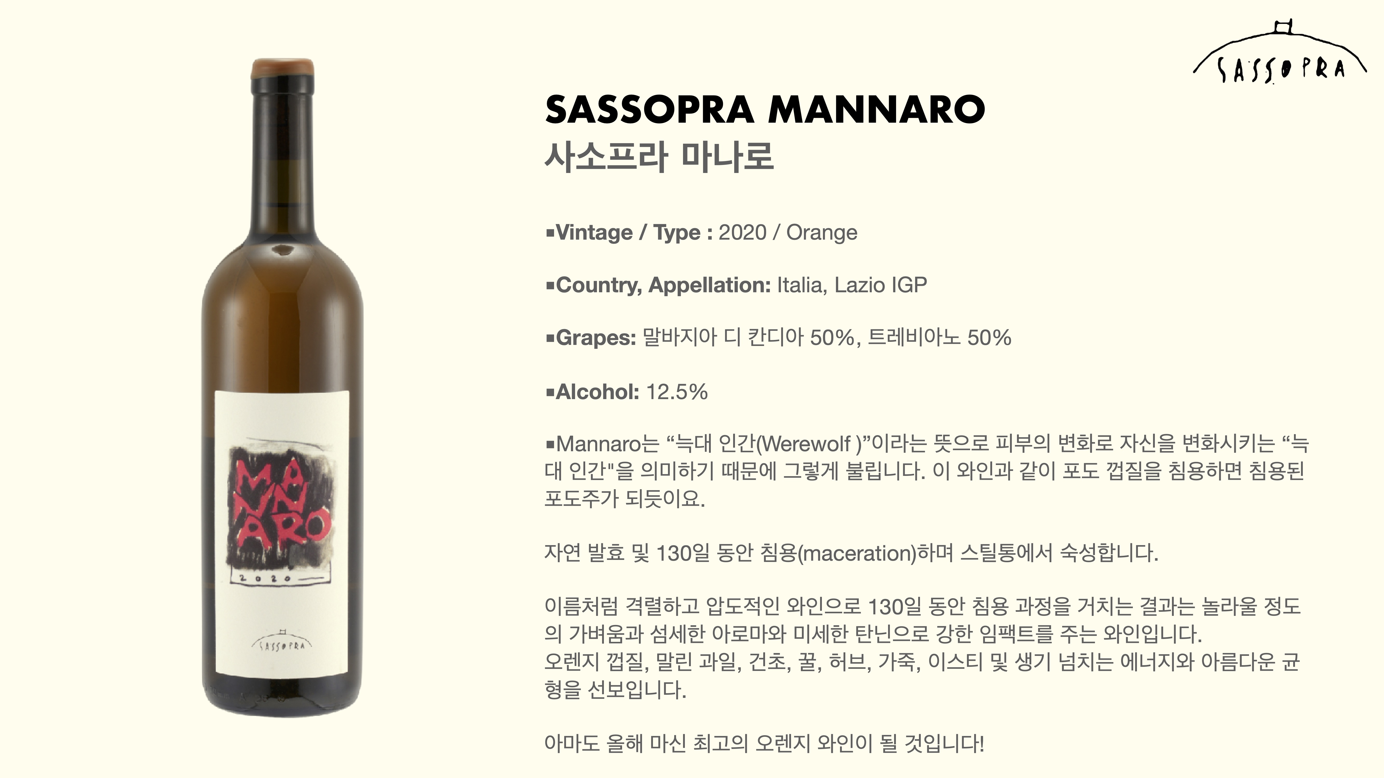 Mannaro는 “늑대 인간(Werewolf )”이라는 뜻으로 피부의 변화로 자신을 변화시키는 “늑 대 인간"을 의미하기 때문에 그렇게 불립니다. 이 와인과 같이 포도 껍질을 침용하면 침용된 포도주가 되듯이요.