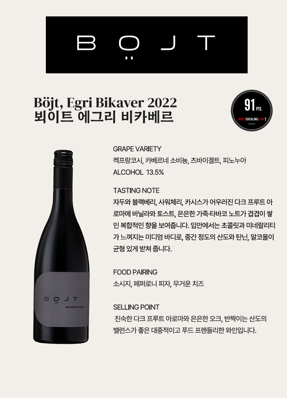 에그리 비카베르Egri Bikavér는 원산지 명칭 보호(PDO: protected designation of origin)를 통해 국가에서 관리되고 있는 플래그쉽 레드 블렌드입니다. 토착품종인 켁프랑코시Kékfrankos를 중심으로 카타르카Kadarka, 카베르네 프랑Cabernet Franc, 메를로Merlot 등 13종의 품종 중에 3가지 이상을 섞어 만들어야 합니다. 짙은 탄닌과 훌륭한 구조감이 특징입니다.