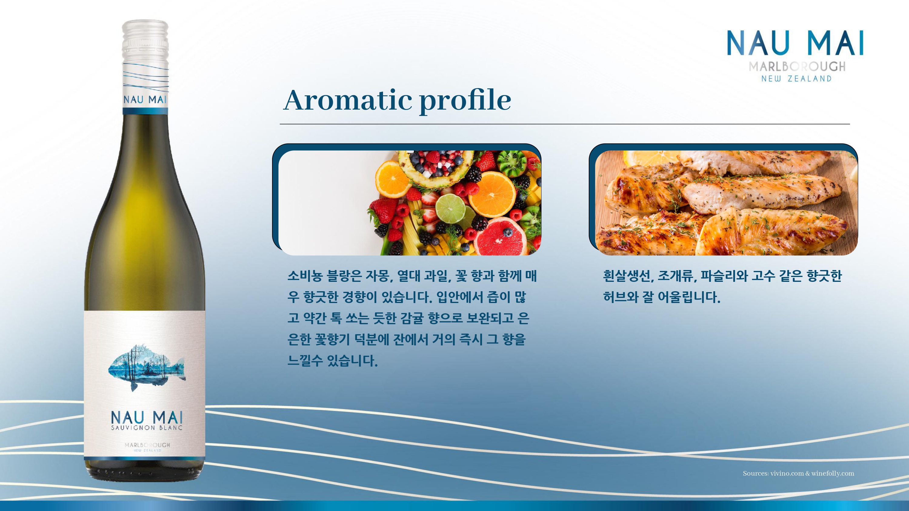 과일 향: 자몽, 라임, 레몬 같은 시트러스 계열부터 패션프루트, 망고, 파인애플 같은 열대 과일의 풍미가 조화를 이룹니다. 허브 및 식물 향: 갓 자른 풀, 피망, 아스파라거스, 허브(민트 등)의 향이 섞여 있어 신선함을 더합니다.