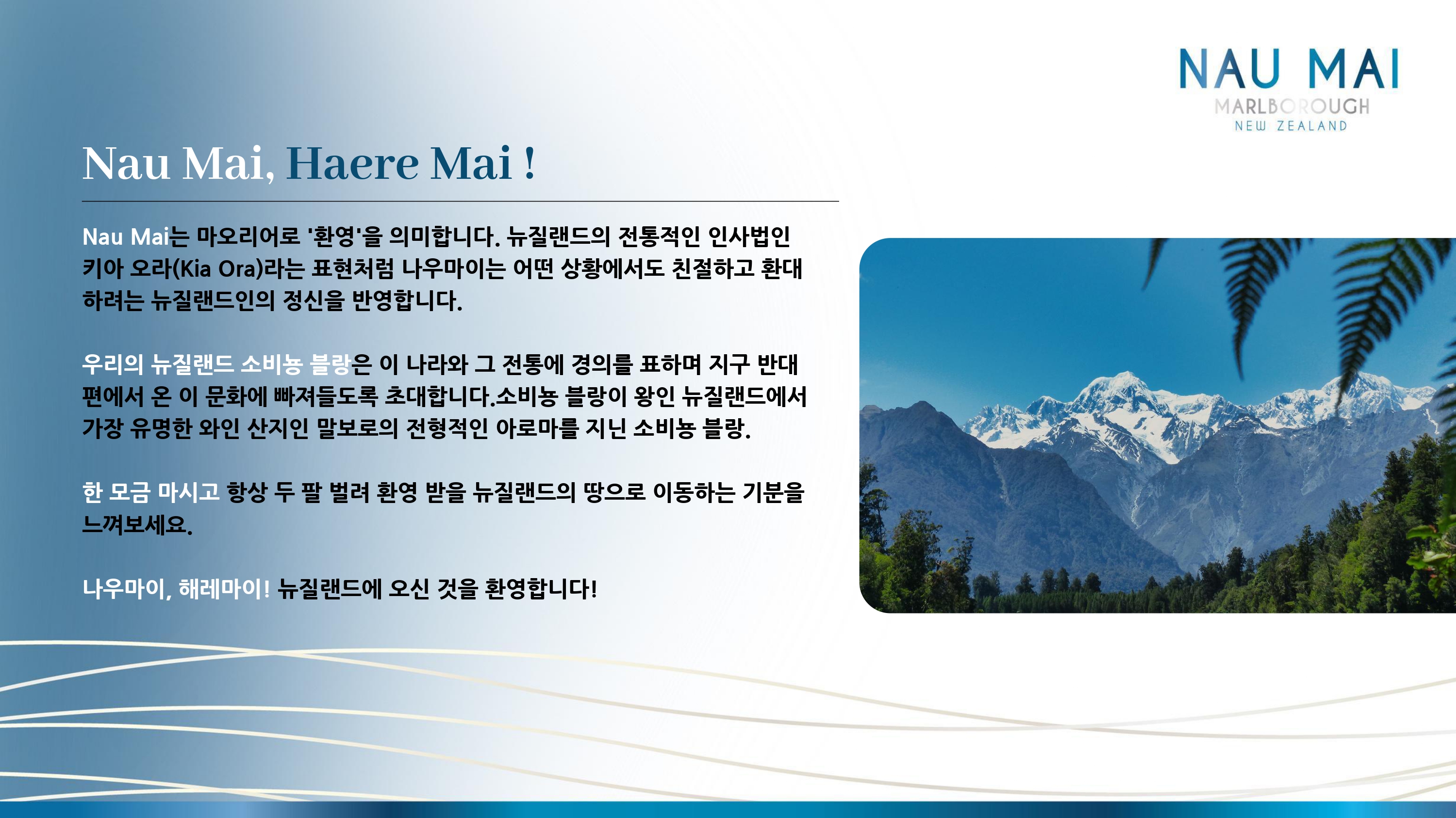Nau Mai(나우 마이)는 마오리어로 "환영합니다(Welcome)"라는 뜻을 가지고 있어, 사람들과 함께 즐기기 좋은 환대의 의미를 담고 있습니다.