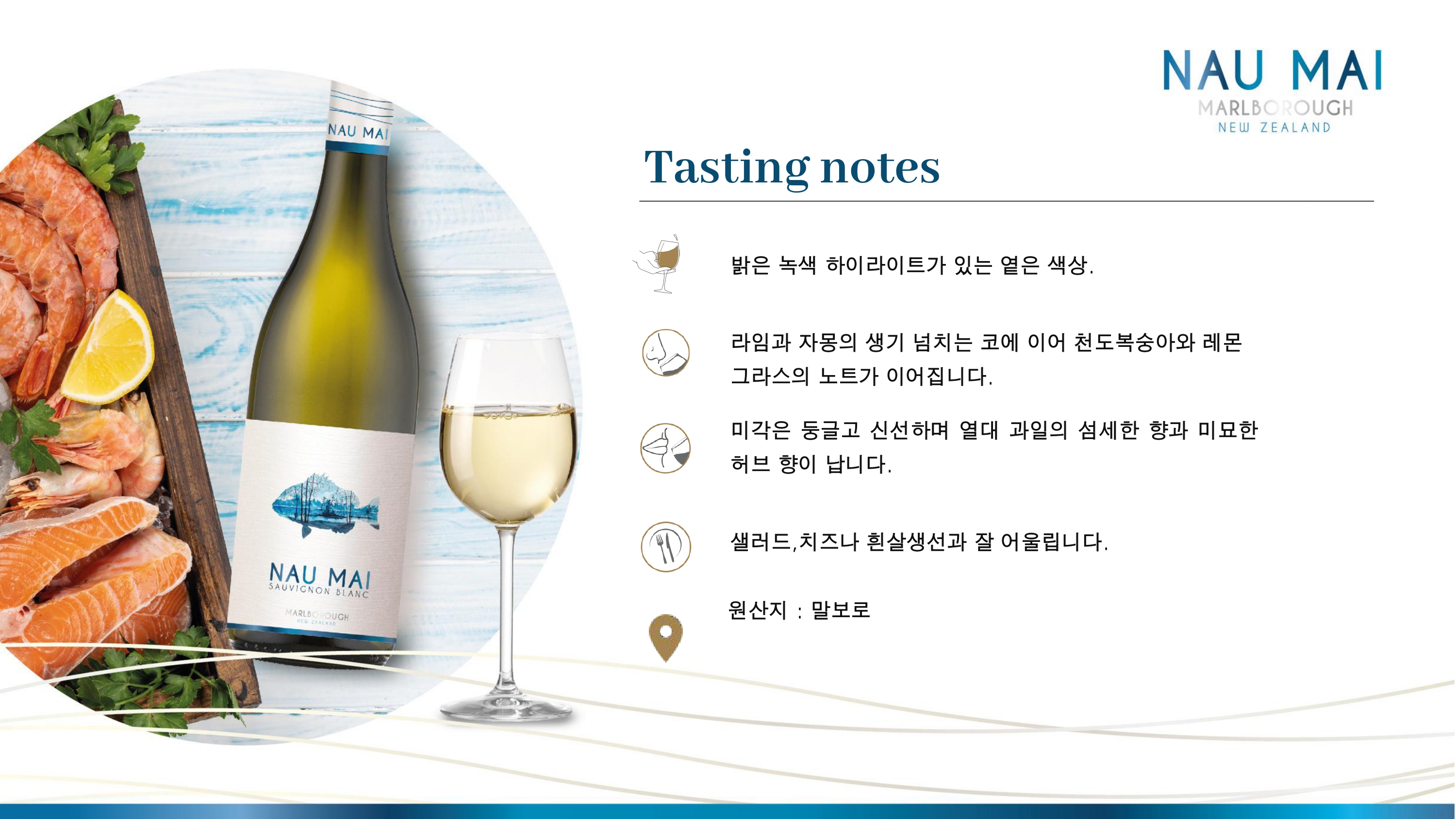▶ 푸드 페어링 : 흰살 생선회 및 구이류, 샐러드 등의 해산물