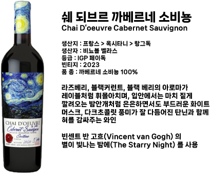 술창고라는 뜻의 ‘Chai (쉐)’ 와 비슷한 발음의 명작이라는 뜻의 ‘Chef-doeuvre (쉐-되브르)’를 합친 이름으로 예술적인 아트 레이블을 강조한 와인