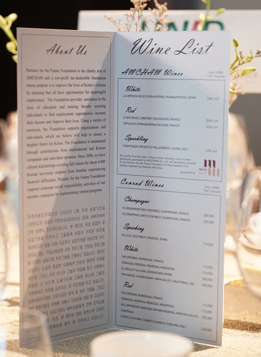총 41개의 국내외 기업 CEO를 포함한 440여 명이 참석한 'CEO Servers’ Night 2025'의 저녁 만찬 와인 (김앤장, 록히드마틴, 랄프로렌, 에스티로더, 모데나 CEO 등 참석)