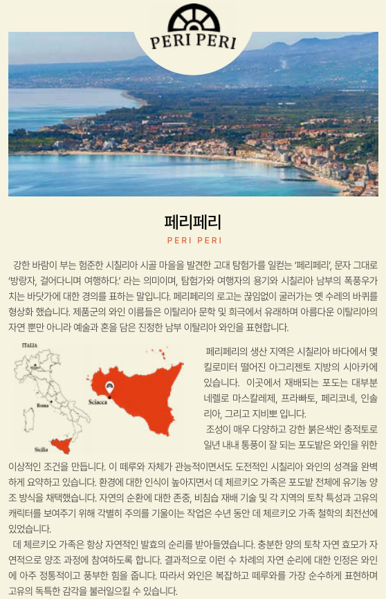 잘 익은 체리와 붉은 건포도를 포함한 붉은 과실의 풍부한 맛이 느껴지고, 기분 좋은 산도와 부드러운 탄닌감을 제공합니다.