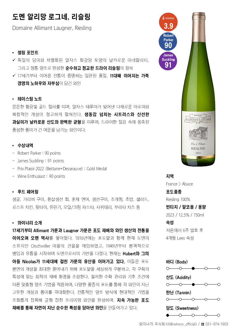 은은한 황금빛 골드 컬러를 띠며, 알자스 테루아가 빚어낸 다채로운 아로마와 복합적인 개성이 정교하게 펼쳐진다. 생동감 넘치는 시트러스와 신선한 과실미가 날카로운 산도와 완벽한 균형을 이루며, 드라이한 질감 속에 응축된 풍성한 풍미가 긴 여운을 남기는 와인이다.