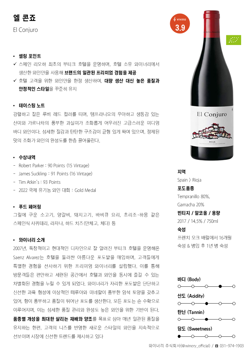 강렬하고 짙은 루비 레드 컬러를 띠며, 템프라니요의 우아하고 생동감 있는 산미와 가르나차의 풍부한 과실미가 조화롭게 어우러진 고급스러운 미디엄 바디 와인이다. 섬세한 질감과 탄탄한 구조감이 균형 있게 짜여 있으며, 정제된 맛의 조화가 와인의 완성도를 한층 끌어올린다.