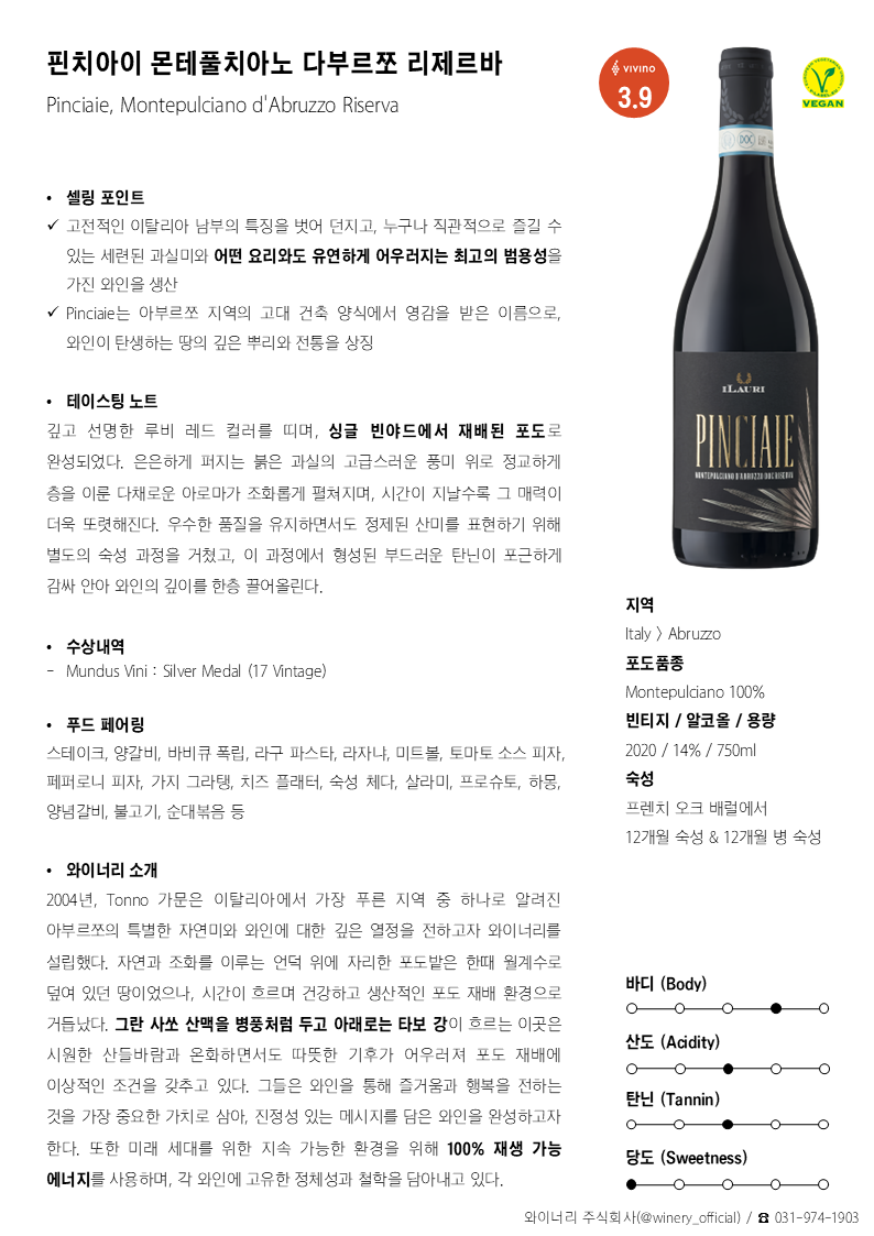 2004년, Tonno 가문은 이탈리아에서 가장 푸른 지역 중 하나로 알려진 아부르쪼의 특별한 자연미와 와인에 대한 깊은 열정을 전하고자 와이너리를 설립했다. 자연과 조화를 이루는 언덕 위에 자리한 포도밭은 한때 월계수로 덮여 있던 땅이었으나, 시간이 흐르며 건강하고 생산적인 포도 재배 환경으로 거듭났다. 그란 사쏘 산맥을 병풍처럼 두고 아래로는 타보 강이 흐르는 이곳은 시원한 산들바람과 온화하면서도 따뜻한 기후가 어우러져 포도 재배에 이상적인 조건을 갖추고 있다. 그들은 와인을 통해 즐거움과 행복을 전하는 것을 가장 중요한 가치로 삼아, 진정성 있는 메시지를 담은 와인을 완성하고자 한다. 또한 미래 세대를 위한 지속 가능한 환경을 위해 100% 재생 가능 에너지를 사용하며, 각 와인에 고유한 정체성과 철학을 담아내고 있다