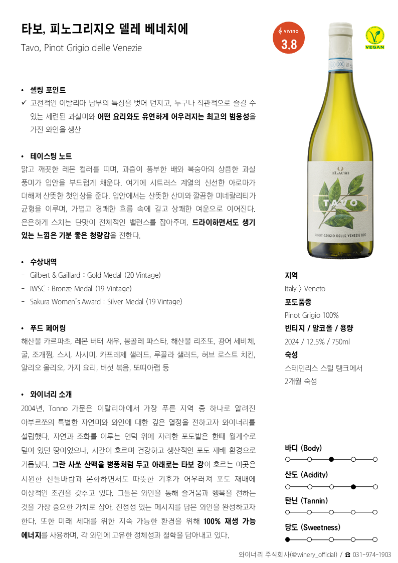 맑고 깨끗한 레몬 컬러를 띠며, 과즙이 풍부한 배와 복숭아의 상큼한 과실 풍미가 입안을 부드럽게 채운다. 여기에 시트러스 계열의 신선한 아로마가 더해져 산뜻한 첫인상을 준다. 입안에서는 산뜻한 산미와 깔끔한 미네랄리티가 균형을 이루며, 가볍고 경쾌한 흐름 속에 길고 상쾌한 여운으로 이어진다. 은은하게 스치는 단맛이 전체적인 밸런스를 잡아주며, 드라이하면서도 생기 있는 느낌은 기분 좋은 청량감을 전한다.
