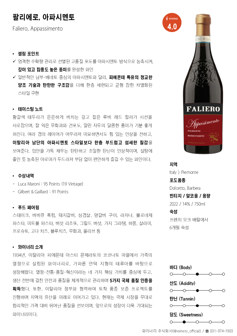 황갈색 테두리가 은은하게 비치는 깊고 짙은 루비 레드 컬러가 시선을 사로잡으며, 잘 익은 무화과와 건포도, 말린 자두의 달콤한 풍미가 기분 좋게 퍼진다. 여러 겹의 레이어가 어우러져 미묘하면서도 힘 있는 인상을 전하고, 이탈리아 남단의 아파시멘토 스타일보다 한층 부드럽고 섬세한 질감을 보여준다. 입안을 가득 채우는 탄탄하고 조밀한 탄닌이 인상적이며, 설탕에 졸인 듯 농축된 아로마가 두드러져 부담 없이 편안하게 즐길 수 있는 와인이다.