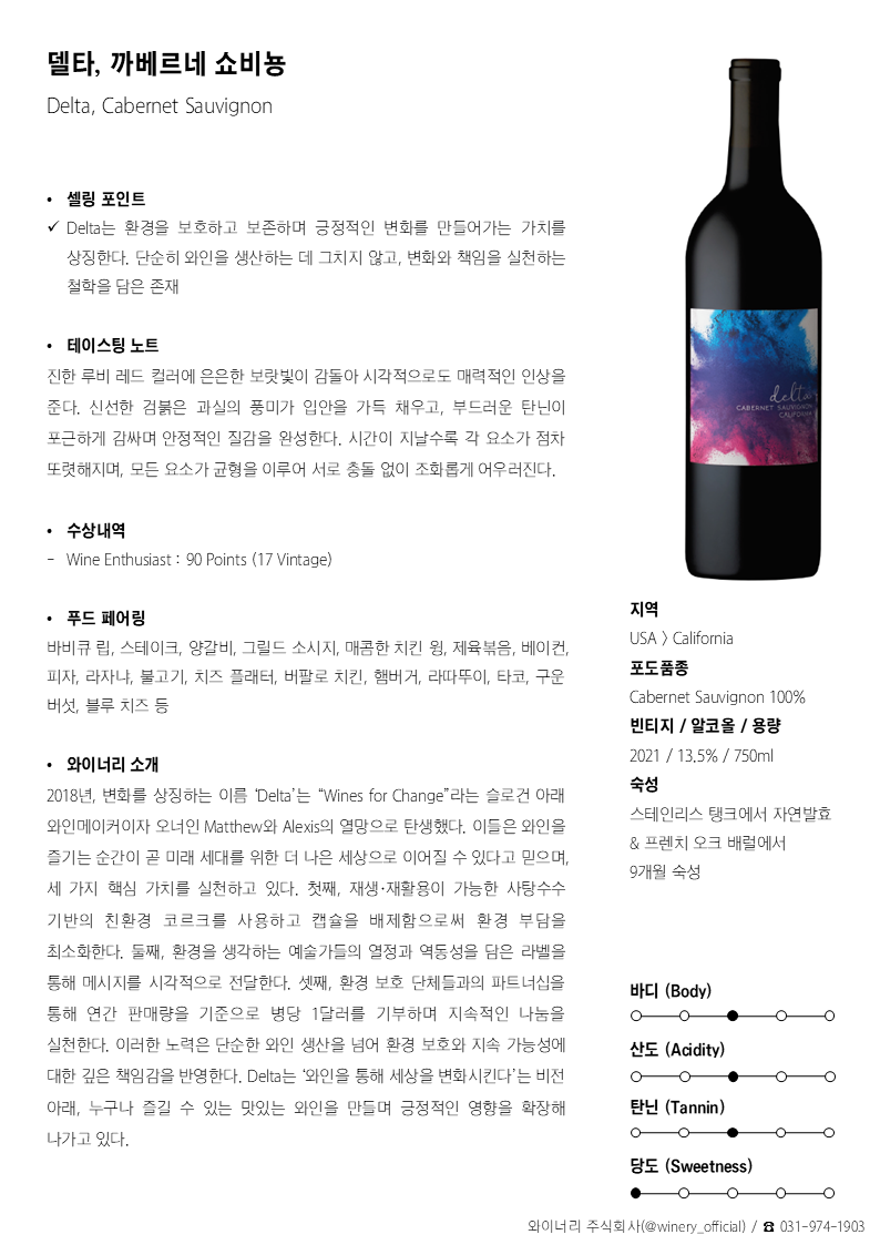 2018년, 변화를 상징하는 이름 ‘Delta’는 “Wines for Change”라는 슬로건 아래 와인메이커이자 오너인 Matthew와 Alexis의 열망으로 탄생했다. 이들은 와인을 즐기는 순간이 곧 미래 세대를 위한 더 나은 세상으로 이어질 수 있다고 믿으며, 세 가지 핵심 가치를 실천하고 있다. 첫째, 재생·재활용이 가능한 사탕수수 기반의 친환경 코르크를 사용하고 캡슐을 배제함으로써 환경 부담을 최소화한다. 둘째, 환경을 생각하는 예술가들의 열정과 역동성을 담은 라벨을 통해 메시지를 시각적으로 전달한다. 셋째, 환경 보호 단체들과의 파트너십을 통해 연간 판매량을 기준으로 병당 1달러를 기부하며 지속적인 나눔을 실천한다. 이러한 노력은 단순한 와인 생산을 넘어 환경 보호와 지속 가능성에 대한 깊은 책임감을 반영한다. Delta는 ‘와인을 통해 세상을 변화시킨다’는 비전 아래, 누구나 즐길 수 있는 맛있는 와인을 만들며 긍정적인 영향을 확장해 나가고 있다.