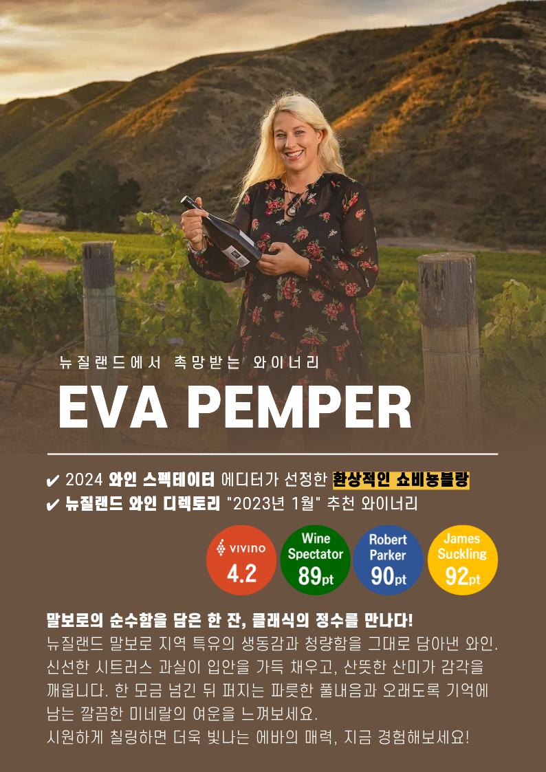 오너이자 와인메이커인 Eva는 유년 시절부터 와인메이커인 부모에게서 도전정신과 열정을 배우며 재능 있는 생산자로 성장했다. 대학에서 포도재배와 양조학을 전공한 뒤, 말보로 지역의 여러 와이너리에서 경험을 쌓으며 전통 양조에 대한 깊은 이해와 실무 역량을 다졌다. 2019년 자신의 이름을 건 프리미엄 와이너리를 설립한 이후, 싱글 빈야드 중심의 엄격한 기준 아래 고품질 포도를 재배하며, 현재는 뉴질랜드에서 가장 주목받는 와이너리 중 하나로 자리매김하고 있다.