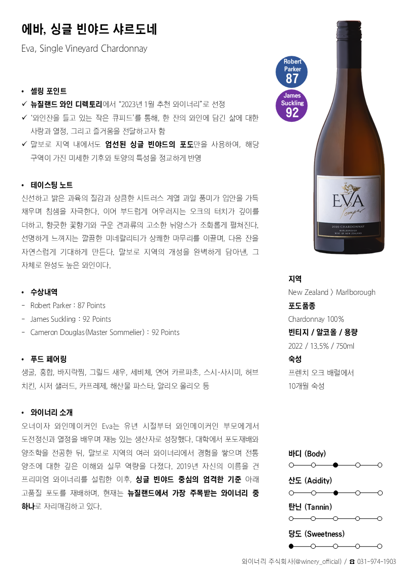 오너이자 와인메이커인 Eva는 유년 시절부터 와인메이커인 부모에게서 도전정신과 열정을 배우며 재능 있는 생산자로 성장했다. 대학에서 포도재배와 양조학을 전공한 뒤, 말보로 지역의 여러 와이너리에서 경험을 쌓으며 전통 양조에 대한 깊은 이해와 실무 역량을 다졌다. 2019년 자신의 이름을 건 프리미엄 와이너리를 설립한 이후, 싱글 빈야드 중심의 엄격한 기준 아래 고품질 포도를 재배하며, 현재는 뉴질랜드에서 가장 주목받는 와이너리 중 하나로 자리매김하고 있다.