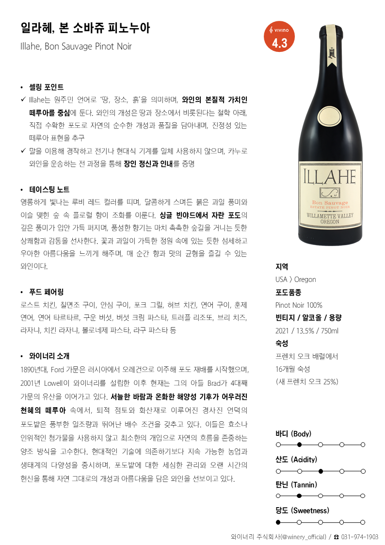 영롱하게 빛나는 루비 레드 컬러를 띠며, 달콤하게 스며든 붉은 과일 풍미와 이슬 맺힌 숲 속 플로럴 향이 조화를 이룬다. 싱글 빈야드에서 자란 포도의 깊은 풍미가 입안 가득 퍼지며, 풍성한 향기는 마치 촉촉한 숲길을 거니는 듯한 상쾌함과 감동을 선사한다. 꽃과 과일이 가득한 정원 속에 있는 듯한 섬세하고 우아한 아름다움을 느끼게 해주며, 매 순간 향과 맛의 균형을 즐길 수 있는 와인이다.
