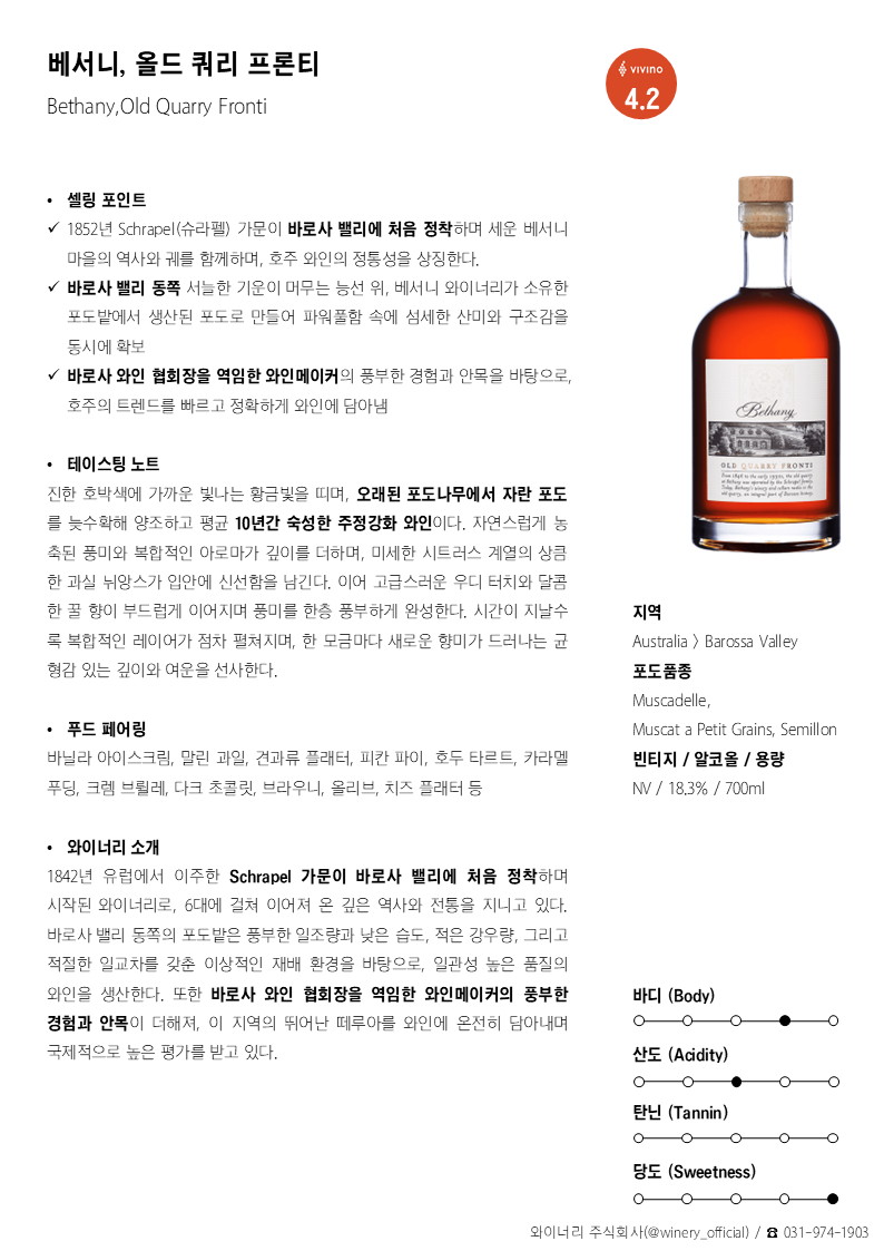 진한 호박색에 가까운 빛나는 황금빛을 띠며, 오래된 포도나무에서 자란 포도를 늦수확해 양조하고 평균 10년간 숙성한 주정강화 와인이다. 자연스럽게 농축된 풍미와 복합적인 아로마가 깊이를 더하며, 미세한 시트러스 계열의 상큼한 과실 뉘앙스가 입안에 신선함을 남긴다. 이어 고급스러운 우디 터치와 달콤한 꿀 향이 부드럽게 이어지며 풍미를 한층 풍부하게 완성한다. 시간이 지날수록 복합적인 레이어가 점차 펼쳐지며, 한 모금마다 새로운 향미가 드러나는 균형감 있는 깊이와 여운을 선사한다.