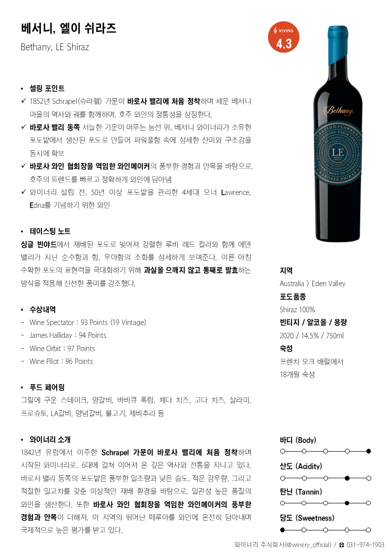 싱글 빈야드에서 재배된 포도로 빚어져 강렬한 루비 레드 컬러와 함께 에덴 밸리가 지닌 순수함과 힘, 우아함의 조화를 섬세하게 보여준다. 이른 아침 수확한 포도의 표현력을 극대화하기 위해 과실을 으깨지 않고 통째로 발효하는 방식을 적용해 신선한 풍미를 강조했다.