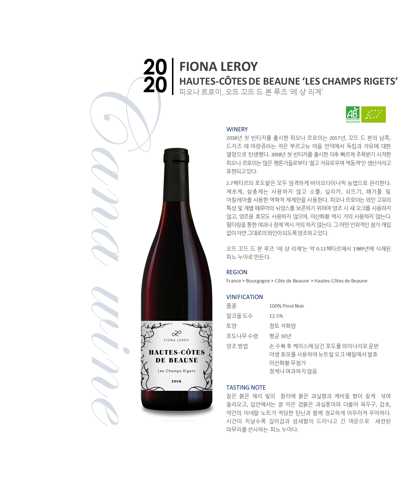 Fiona Leroy, Hautes-Cotes de Beaune Rouge 'Les Champs Rigets'