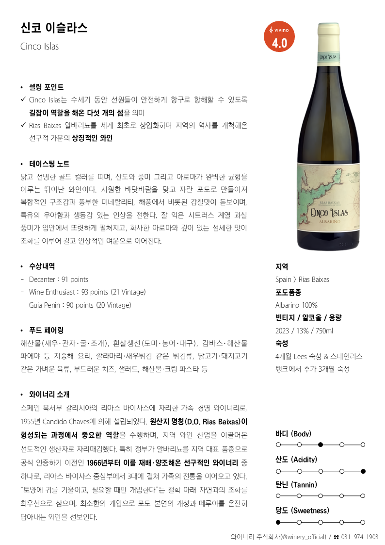 밝고 선명한 골드 컬러를 띠며, 산도와 풍미 그리고 아로마가 완벽한 균형을 이루는 뛰어난 와인이다. 시원한 바닷바람을 맞고 자란 포도로 만들어져 복합적인 구조감과 풍부한 미네랄리티, 해풍에서 비롯된 감칠맛이 돋보이며, 특유의 우아함과 생동감 있는 인상을 전한다. 잘 익은 시트러스 계열 과실 풍미가 입안에서 또렷하게 펼쳐지고, 화사한 아로마와 깊이 있는 섬세한 맛이 조화를 이루어 길고 인상적인 여운으로 이어진다.