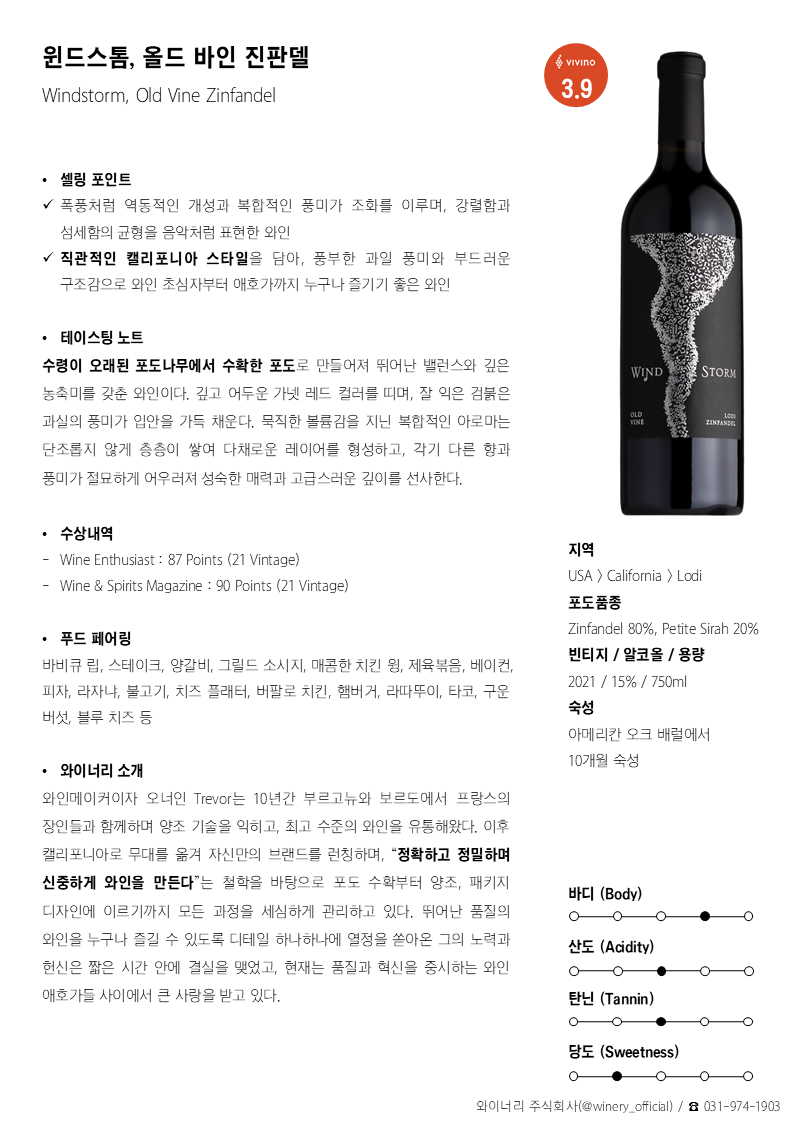 수령이 오래된 포도나무에서 수확한 포도로 만들어져 뛰어난 밸런스와 깊은 농축미를 갖춘 와인이다. 깊고 어두운 가넷 레드 컬러를 띠며, 잘 익은 검붉은 과실의 풍미가 입안을 가득 채운다. 묵직한 볼륨감을 지닌 복합적인 아로마는 단조롭지 않게 층층이 쌓여 다채로운 레이어를 형성하고, 각기 다른 향과 풍미가 절묘하게 어우러져 성숙한 매력과 고급스러운 깊이를 선사한다.