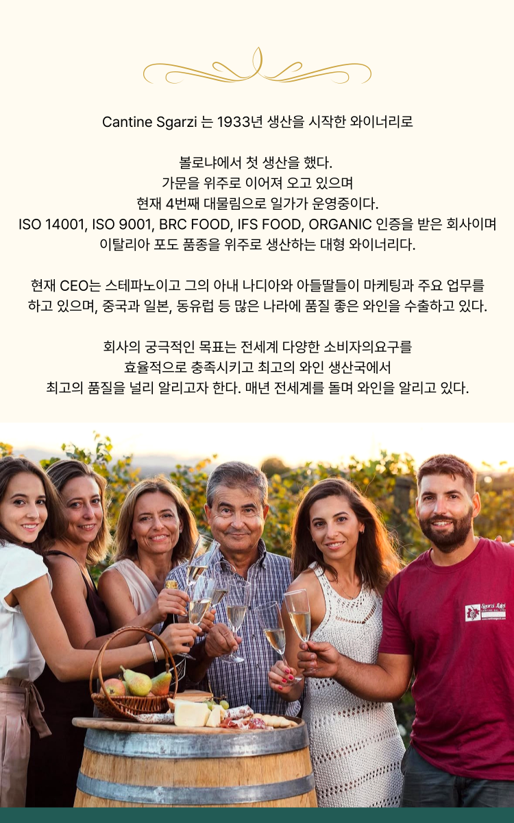 볼로냐에서 첫 생산을 했다. 가문을 위주로 이어져 오고 있으며, 현재 4번째 대물림으로 일가가 운영중이다. ISO 14001, ISO 9001, BRC FOOD, IFS FOOD, ORGANIC 인증을 받은 회사이며, 이탈리아 포도 품종을 위주로 생산하는 대형 와이너리다.