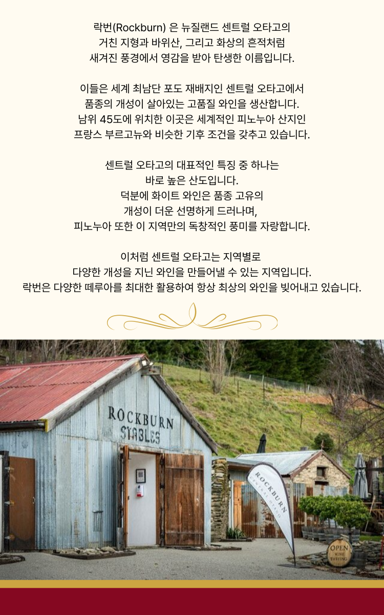 이처럼 센트럴 오타고는 지역별로 다양한 개성을 지닌 와인을 만들어낼 수 있는 지역입니다. 락번은 다양한 떼루아를 최대한 활용하여 항상 최상의 와인을 빚어내고 있습니다.
