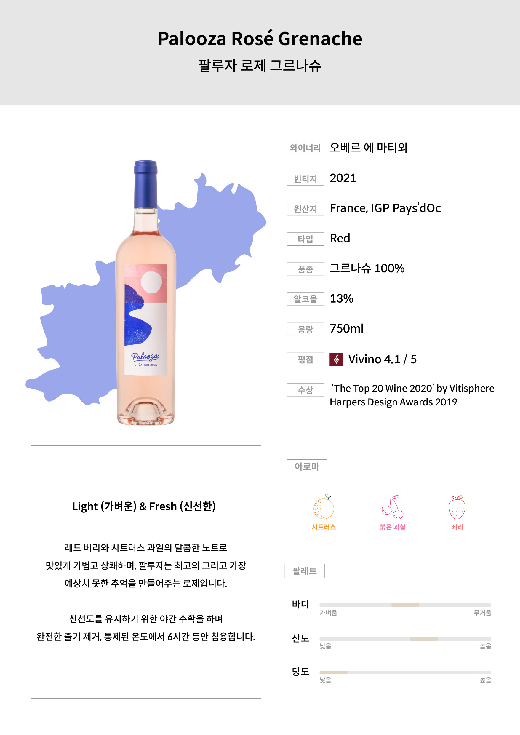 레드 베리와 시트러스 과일의 달콤한 노트로 맛있게 가볍고 상쾌하며, 팔루자는 최고의 그리고 가장 예상치 못한 추억의 로제입니다.