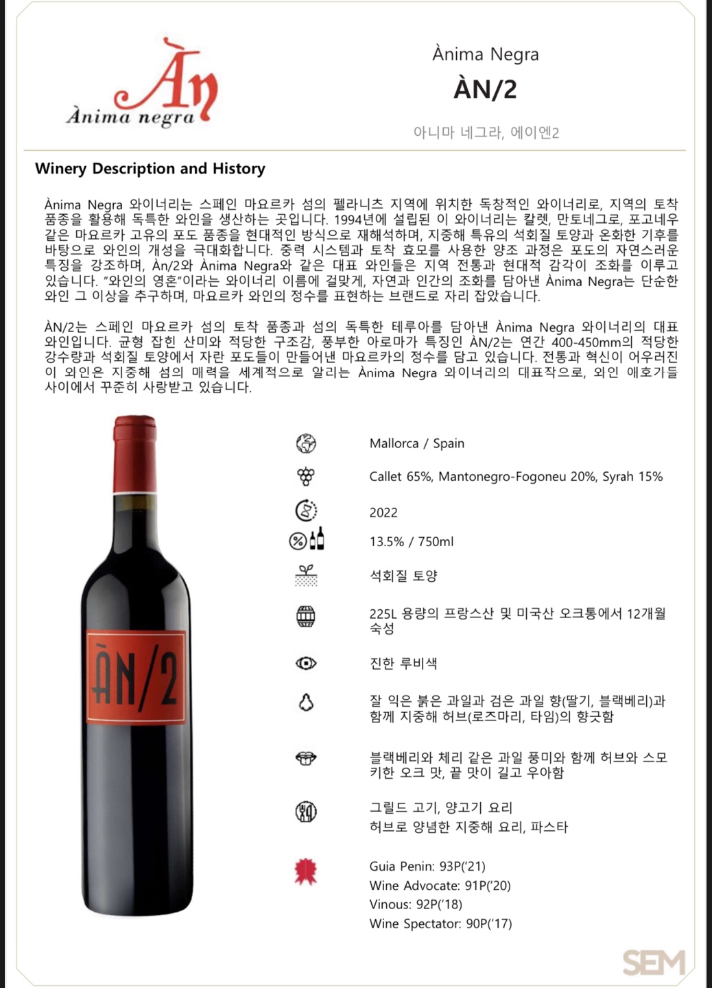 블랙베리와 체리 같은 과일 풍미와 함께 허브와 스모키한 오크 맛, 끝 맛이 길고 우아함