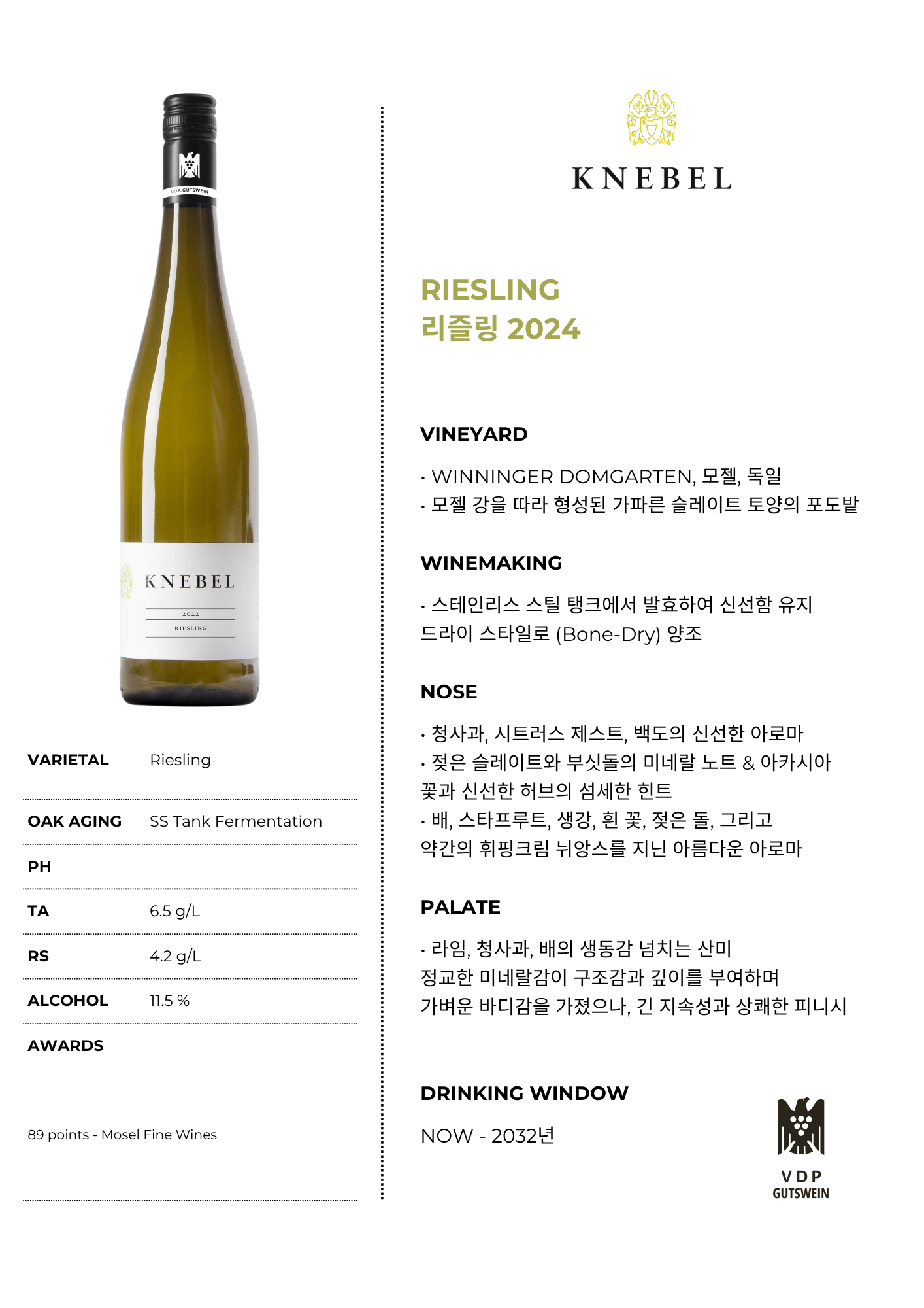현재 Weingut Knebel은 독일 최고 와이너리 협회인 VDP(Verband Deutscher Prädikatsweingüter)의 정식 회원으로, 독일을 대표하는 모젤 리즐링 생산자로 자리잡고 있으며, 모젤 지역의 리즐링 와인들을 정기적으로 리뷰하는 전문 매체인 Mosel Fine Wines로 부터 뛰어난 평가를 받고 있습니다.