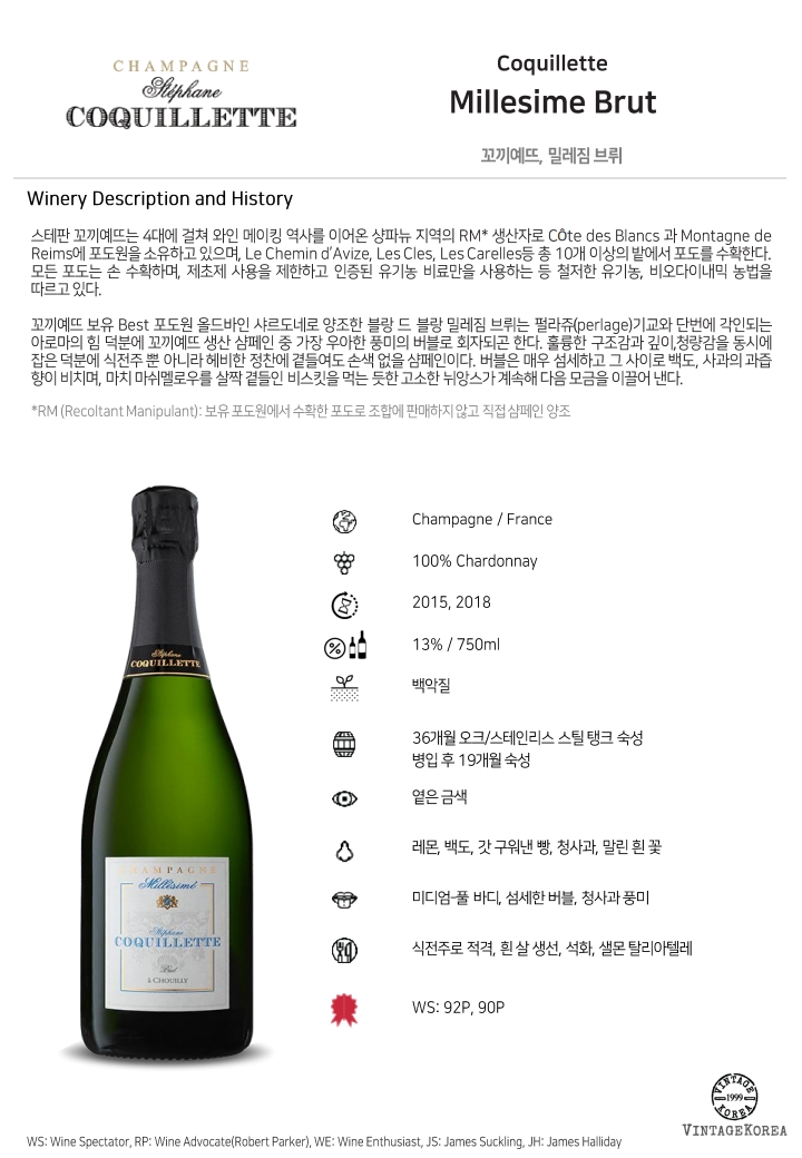 꼬끼예뜨 보유 Best 포도원 올드바인 샤르도네로 양조한 블랑 드 블랑 밀레짐 브뤼는 펄라쥬(perlage)기교와 단번에 각인되는 아로마의 힘 덕분에 꼬끼예뜨 생산 샴페인 중 가장 우아한 풍미의 버블로 회자되곤 한다. 훌륭한 구조감과 깊이,청량감을 동시에 잡은 덕분에 식전주 뿐 아니라 헤비한 정찬에 곁들여도 손색 없을 샴페인이다. 버블은 매우 섬세하고 그 사이로 백도, 사과의 과즙 향이 비치며, 마치 마쉬멜로우를 살짝 곁들인 비스킷을 먹는 듯한 고소한 뉘앙스가 계속해 다음 모금을 이끌어 낸다.