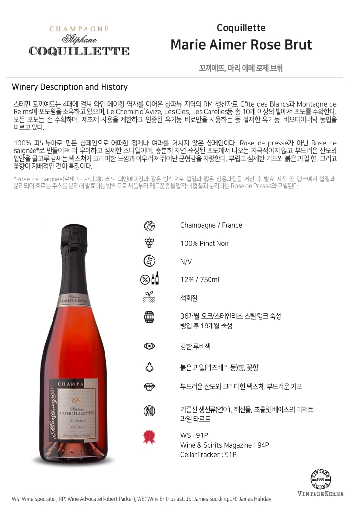 100% 피노누아로 만든 샴페인으로 어떠한 정제나 여과를 거치지 않은 샴페인이다. Rose de presse가 아닌 Rose de saignée*로 만들어져 더 우아하고 섬세한 스타일이며, 충분히 자연 숙성된 포도에서 나오는 자극적이지 않고 부드러운 산도와 입안을 골고루 감싸는 텍스쳐가 크리미한 느낌과 어우러져 뛰어난 균형감을 자랑한다. 부럽고 섬세한 기포와 붉은 과일 향, 그리고 꽃향이 지배적인 것이 특징이다.