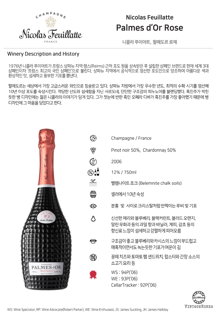 팔메도르는 세상에서 가장 고급스러운 와인으로 칭송받고 있다. 샹파뉴 지방에서 가장 우수한 년도, 최적의 수확 시기를 엄선해 10년 이상 포도를 숙성시킨다. 적당한 산도와 섬세함을 지닌 샤르도네, 단단한 구조감의 피누노아를 블렌딩했다. 흑진주가 박힌 듯한 병 디자인에는 젊은 니콜라의 이야기가 담겨 있다. 그가 첫눈에 반한 흑인 오페라 디바가 흑진주를 가장 좋아했기 때문에 병 디자인에 그 마음을 담았다고 한다.