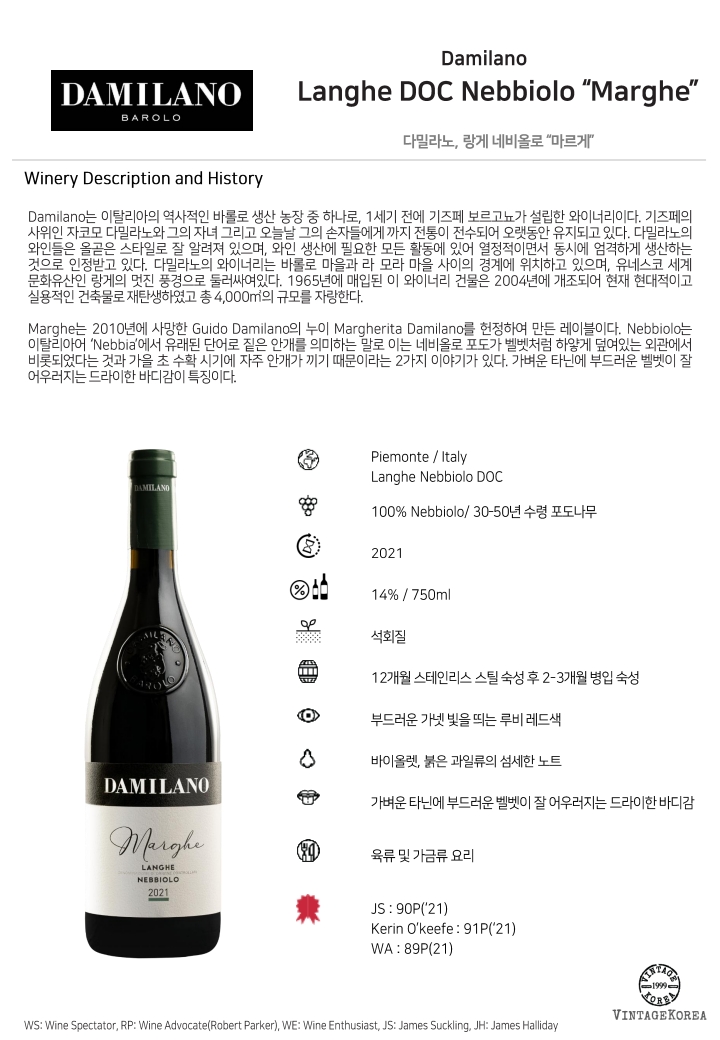 Marghe는 2010년에 사망한 Guido Damilano의 누이 Margherita Damilano를 헌정하여 만든 레이블이다. Nebbiolo는 이탈리아어 ‘Nebbia’에서 유래된 단어로 짙은 안개를 의미하는 말로 이는 네비올로 포도가 벨벳처럼 하얗게 덮여있는 외관에서 비롯되었다는 것과 가을 초 수확 시기에 자주 안개가 끼기 때문이라는 2가지 이야기가 있다. 가벼운 타닌에 부드러운 벨벳이 잘 어우러지는 드라이한 바디감이 특징이다.