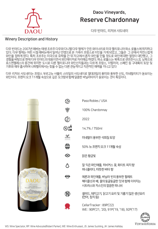 다우 리저브 샤도네이는 프랑스 부르고뉴 샤블리 스타일의 샤도네이로 열대과일의 풍미와 풍부한 산도, 미네랄리티가 돋보이는 와인이다. 프렌치 오크 11개월 숙성으로 깊은 오크향과 함께 달콤한 바닐라터치가 돋보이는 것이 특징이다.