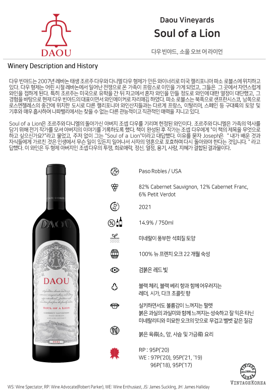 Soul of a Lion은 조르주와 다니엘의 돌아가신 아버지 조셉 다우를 기리며 헌정된 와인이다. 조르주와 다니엘은 가족의 역사를 담기 위해 전기 작가를 모셔 아버지의 이야기를 기록하도록 했다. 책이 완성된 후 작가는 조셉 다우에게 "이 책의 제목을 무엇으로 하고 싶으신가요?"라고 물었고, 주저 없이 그는 "Soul of a Lion"이라고 대답했다. 이유를 묻자 Joseph은 "내가 배운 것과 자식들에게 가르친 것은 인생에서 무슨 일이 있든지 일어나서 사자의 영혼으로 포효하며 다시 돌아와야 한다는 것입니다."라고 답했다. 이 와인은 두 형제 아버지인 조셉 다우의 투쟁, 희로애락, 정신, 열정, 용기, 사랑, 지혜가 결합된 결과물이다.
