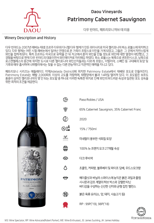 패트리모니 시리즈는 애들레이드 지역(Adelaida District)에 위치한 Patrimony Estate에서 재배된 포도로 만들어진다. Patrimony Estate는 해발 2,000피트 이상의 고도를 자랑하며, 태평양에서 불과 14마일 떨어져 있다. 이 포도밭은 보르도 품종이 심어진 캘리포니아의 몇 안 되는 포도밭 중 하나로 이러한 독특한 위치로 인해 와인의 부드러운 숙성과 일관된 포도 성숙을 위한 최적의 조건을 제공한다.