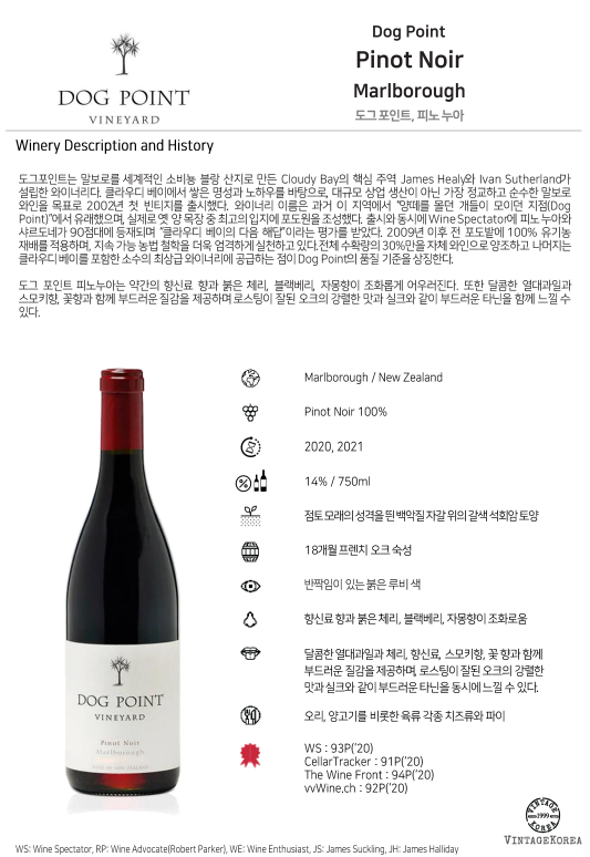 도그 포인트 피노누아는 약간의 향신료 향과 붉은 체리, 블랙베리, 자몽향이 조화롭게 어우러진다. 또한 달콤한 열대과일과 스모키향, 꽃향과 함께 부드러운 질감을 제공하며 로스팅이 잘된 오크의 강렬한 맛과 실크와 같이 부드러운 타닌을 함께 느낄 수 있다.