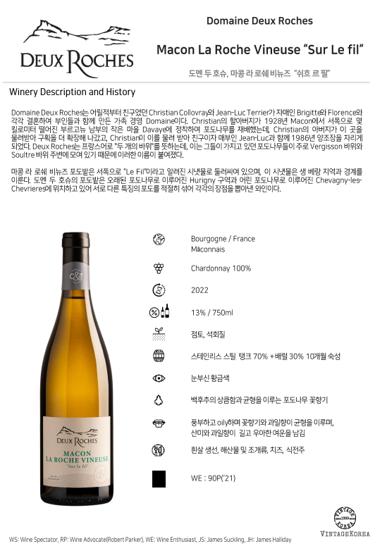마콩 라 로쉐 비뉴즈 포도밭은 서쪽으로 “Le Fil”이라고 알려진 시냇물로 둘러싸여 있으며, 이 시냇물은 생 베랑 지역과 경계를 이룬다. 도멘 두 호슈의 포도밭은 오래된 포도나무로 이루어진 Hurigny 구역과 어린 포도나무로 이루어진 Chevagny-les-Chevrieres에 위치하고 있어 서로 다른 특징의 포도를 적절히 섞어 각각의 장점을 뽑아낸 와인이다.