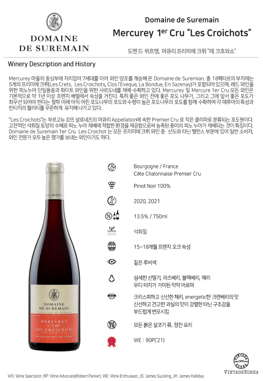 Les Croichots”는 부르고뉴 꼬뜨 샬로네즈의 머큐리 Appellation에 속한 Premier Cru 로 작은 클리마로 분류되는 포도원이다. 고전적인 석회질 토양의 수혜로 피노 누아 재배에 적합한 환경을 제공함으로써 농축된 풍미의 피노 누아가 재배되는 것이 특징이다. Domaine de Suremain 1er Cru Les Croichot 는 모든 프리미에 크뤼 와인 중 산도와 타닌 밸런스 부분에 있어 일반 소비자, 와인 전문가 모두 높은 평가를 보내는 와인이기도 하다.