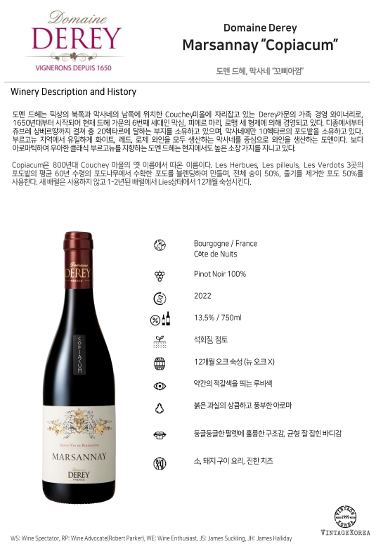 Copiacum은 800년대 Couchey 마을의 옛 이름에서 따온 이름이다. Les Herbues, Les pilleuls, Les Verdots 3곳의 포도밭의 평균 60년 수령의 포도나무에서 수확한 포도를 블렌딩하여 만들며, 전체 송이 50%, 줄기를 제거한 포도 50%를 사용한다. 새 배럴은 사용하지 않고 1-2년된 배럴에서 Lies상태에서 12개월 숙성시킨다.
