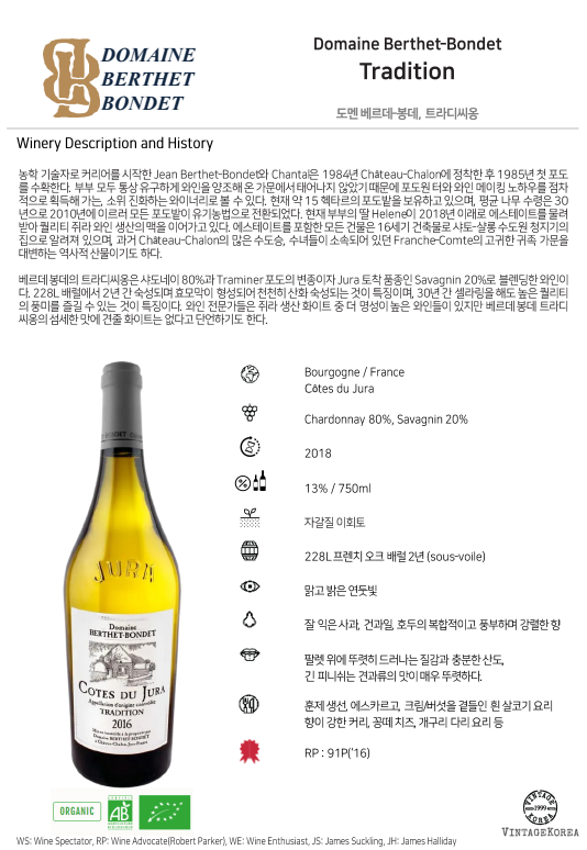 베르데 봉데의 트라디씨옹은 샤도네이 80%과 Traminer 포도의 변종이자 Jura 토착 품종인 Savagnin 20%로 블렌딩한 와인이다. 228L 배럴에서 2년 간 숙성되며 효모막이 형성되어 천천히 산화 숙성되는 것이 특징이며, 30년 간 셀라링을 해도 높은 퀄리티의 풍미를 즐길 수 있는 것이 특징이다. 와인 전문가들은 쥐라 생산 화이트 중 더 명성이 높은 와인들이 있지만 베르데 봉데 트라디씨옹의 섬세한 맛에 견줄 화이트는 없다고 단언하기도 한다.