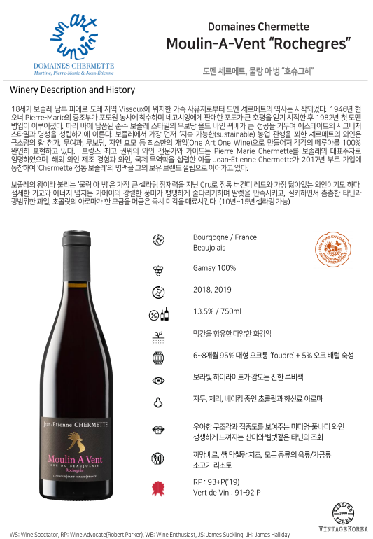 보졸레의 왕이라 불리는 ‘물랑 아 벙’은 가장 큰 셀라링 잠재력을 지닌 Cru로 정통 버건디 레드와 가장 닮아있는 와인이기도 하다. 섬세한 기교와 에너지 넘치는 가메이의 강렬한 풍미가 팽팽하게 줄다리기하며 팔렛을 만족시키고, 실키하면서 촘촘한 타닌과 광범위한 과일, 초콜릿의 아로마가 한 모금을 머금은 즉시 미각을 매료시킨다. (10년~15년 셀라링 가능)