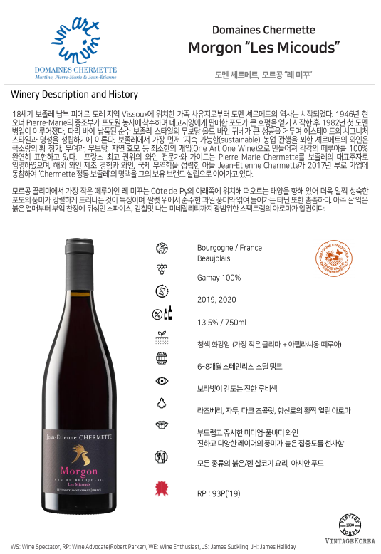 모르공 끌리마에서 가장 작은 떼루아인 레 미꾸는 CÔte de Py의 아래쪽에 위치해 떠오르는 태양을 향해 있어 더욱 일찍 성숙한 포도의 풍미가 강렬하게 드러나는 것이 특징이며, 팔렛 위에서 순수한 과일 풍미와 엮여 들어가는 타닌 또한 촘촘하다. 아주 잘 익은 붉은 열매부터 부엌 찬장에 뒤섞인 스파이스, 감칠맛 나는 미네랄리티까지 광범위한 스펙트럼의 아로마가 압권이다.