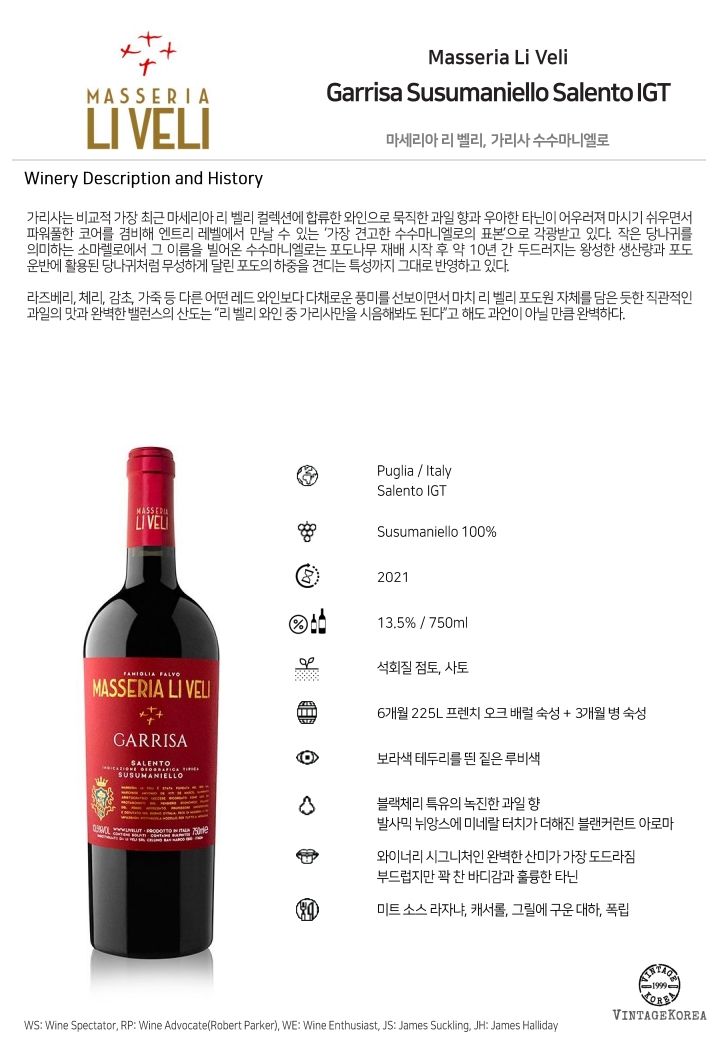 가리사는 비교적 가장 최근 마세리아 리 벨리 컬렉션에 합류한 와인으로 묵직한 과일 향과 우아한 타닌이 어우러져 마시기 쉬우면서 파워풀한 코어를 겸비해 엔트리 레벨에서 만날 수 있는 ‘가장 견고한 수수마니엘로의 표본’으로 각광받고 있다. 작은 당나귀를 의미하는 소마렐로에서 그 이름을 빌어온 수수마니엘로는 포도나무 재배 시작 후 약 10년 간 두드러지는 왕성한 생산량과 포도 운반에 활용된 당나귀처럼 무성하게 달린 포도의 하중을 견디는 특성까지 그대로 반영하고 있다.