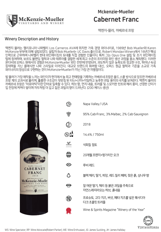 밥 뮬러가 가장 애착을 느끼는 와인이자 현지에서 늘 최고 판매량을 기록하는 까베르네 프랑은 올드 스쿨 방식으로 양조한 까베르네 프랑 계의 교과서로 불리며, 훌륭한 구조감이 뒷받침 된 타닌+산미+치밀하고 농후한 과일 풍미의 극치를 보여준다. 맥켄지 뮬러의 까베르네 프랑은 “아로마틱”이란 단어로 일축할 수 있다. 허브 향, 먼지 내음, 트러플 및 스모키한 힌트와 체리 풍미, 선명한 산미가 입 천장에 켜켜이 쌓이며 자두처럼 더 깊고 짙은 과일의 향이 드러난다. (200 케이스 생산)극소 생산으로 와인리뷰나 평가지에도 실리지 않은 숨은 보석이며, 와인스펙테이터에서는 과거 2009년 빈티지에 96점을 마크하며 “무명에 가까운 맥켄지 뮬러 와인에 이토록 많은 애호가들이 열광하는 이유는 이 가격대에 나파밸리를 한 병에 압축 가능한 와이너리가 그 어디에도 없기 때문”이라고 단언하기도 했다. 일본에서는 ‘Opus One’ 대비 훨씬 합리적인 가격으로 “명장의 명작 까베르네 소비뇽”을 즐길 수 있는 절호의 기회로 맥켄지 뮬러를 선택하고 있다. 부담 없이 즐길 수 있는 나파 와인으로 소개하고 있지만, 단 한 병을 수중에 확보하는 것도 어려운 레어 빈티지 카베르네 쇼비뇽 와인이다.