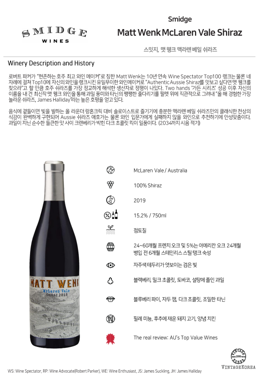 음식에 곁들이면 빛을 발하는 올 라운더 랑혼크릭 대비 솔로이스트로 즐기기에 충분한 맥라렌 베일 쉬라즈만의 클래식한 천상의 식감이 완벽하게 구현되어 Aussie 쉬라즈 애호가는 물론 와인 입문가에게 실패하지 않을 와인으로 추천하기에 안성맞춤이다. 과일이 지닌 순수한 들큰한 맛 사이 크랜베리가 박힌 다크 초콜릿 킥이 일품이다. (2034까지 시음 적기)