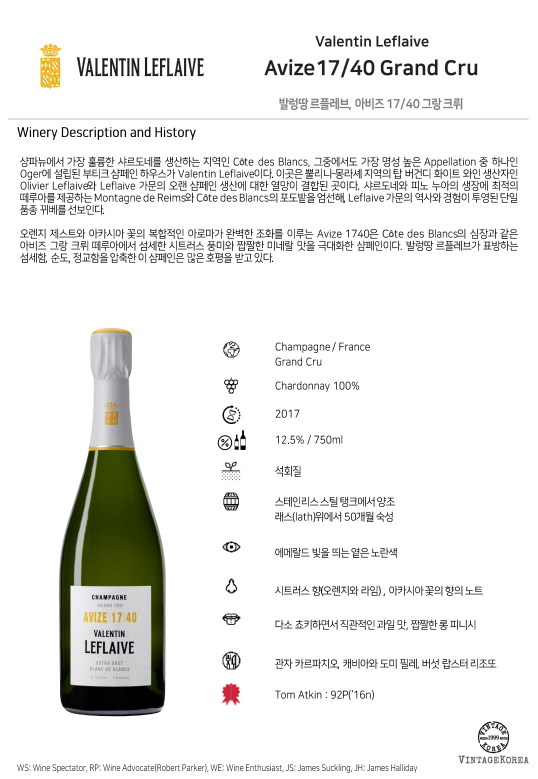 오렌지 제스트와 아카시아 꽃의 복합적인 아로마가 완벽한 조화를 이루는 Avize 1740은 Côte des Blancs의 심장과 같은 아비즈 그랑 크뤼 떼루아에서 섬세한 시트러스 풍미와 짭짤한 미네랄 맛을 극대화한 샴페인이다. 발렁땅 르플레브가 표방하는 섬세함, 순도, 정교함을 압축한 이 샴페인은 많은 호평을 받고 있다.