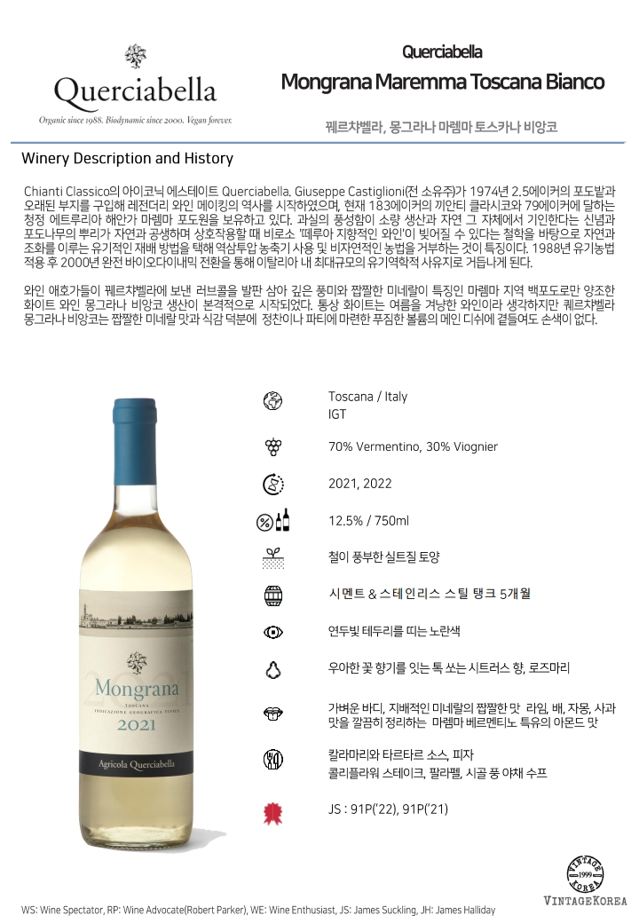 와인 애호가들이 꿰르챠벨라에 보낸 러브콜을 발판 삼아 깊은 풍미와 짭짤한 미네랄이 특징인 마렘마 지역 백포도로만 양조한 화이트 와인 몽그라나 비앙코. 퀘르챠벨라 몽그라나 비앙코는 짭짤한 미네랄 맛과 식감 덕분에 정찬이나 파티에 마련한 푸짐한 볼륨의 메인 디쉬에 곁들여도 손색이 없다.