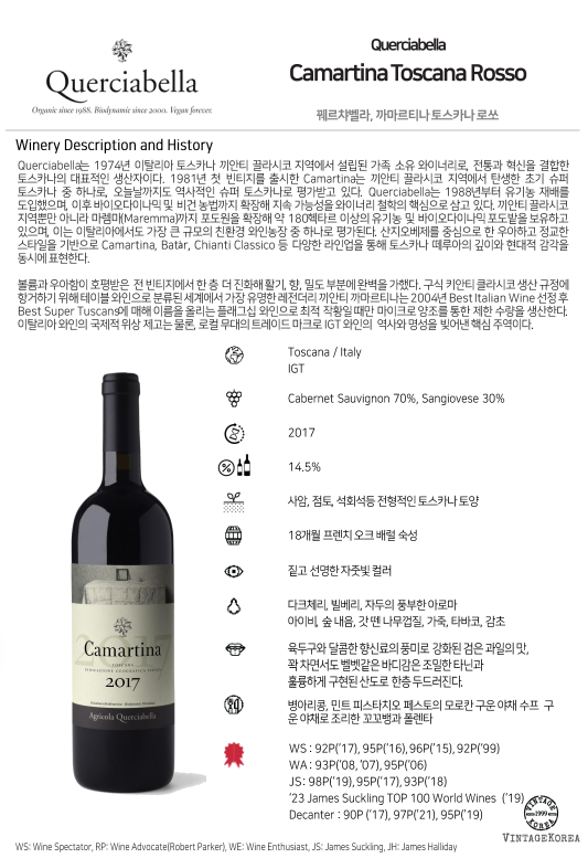 볼륨과 우아함이 호평받은 전 빈티지에서 한 층 더 진화해 활기, 향, 밀도 부분에 완벽을 가했다. 구식 키안티 클라시코 생산 규정에 항거하기 위해 테이블 와인으로 분류된 세계에서 가장 유명한 레전더리 끼안티 까마르티나는 2004년 Best Italian Wine 선정 후 Best Super Tuscans에 매해 이름을 올리는 플래그십 와인으로 최적 작황일 때만 마이크로 양조를 통한 제한 수량을 생산한다. 이탈리아 와인의 국제적 위상 제고는 물론, 로컬 무대의 트레이드 마크로 IGT 와인의 역사와 명성을 빚어낸 핵심 주역이다.