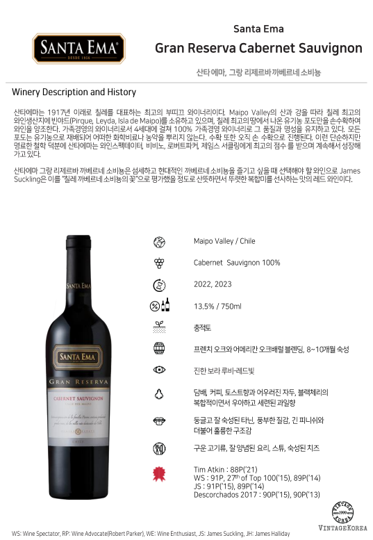 산타에마 그랑 리제르바 까베르네 소비뇽은 섬세하고 현대적인 까베르네 소비뇽을 즐기고 싶을 때 선택해야 할 와인으로 James Suckling은 이를 “칠레 까베르네 소비뇽의 꽃”으로 평가했을 정도로 산뜻하면서 뚜렷한 복합미를 선사하는 맛의 레드 와인이다
