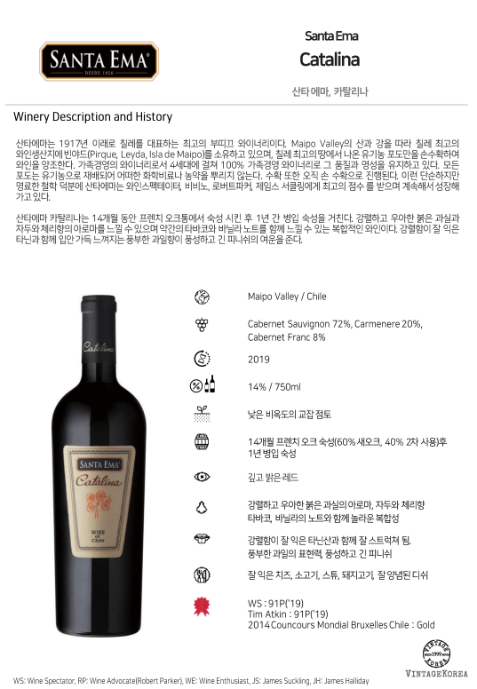 산타에마 카탈리나는 14개월 동안 프렌치 오크통에서 숙성 시킨 후 1년 간 병입 숙성을 거친다. 강렬하고 우아한 붉은 과실과 자두와 체리향의 아로마를 느낄 수 있으며 약간의 타바코와 바닐라 노트를 함께 느낄 수 있는 복합적인 와인이다. 강렬함이 잘 익은 타닌과 함께 입안 가득 느껴지는 풍부한 과일향이 풍성하고 긴 피니쉬의 여운을 준다.