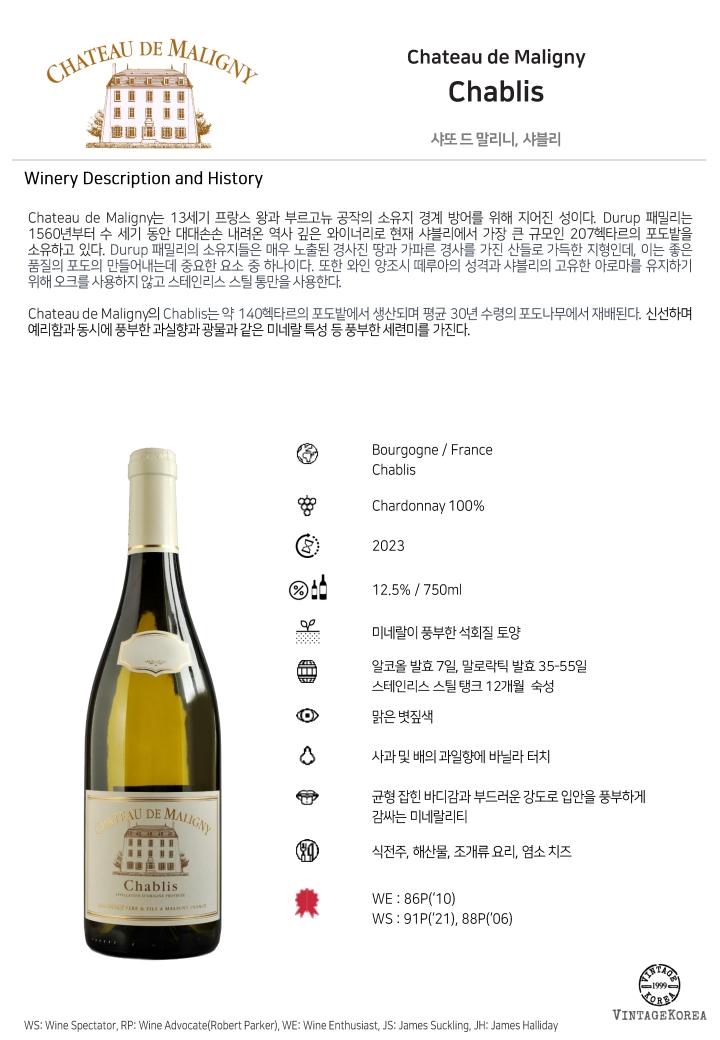 Chateau de Maligny의 Chablis는 약 140헥타르의 포도밭에서 생산되며 평균 30년 수령의 포도나무에서 재배된다. 신선하며 예리함과 동시에 풍부한 과실향과 광물과 같은 미네랄 특성 등 풍부한 세련미를 가진다.
